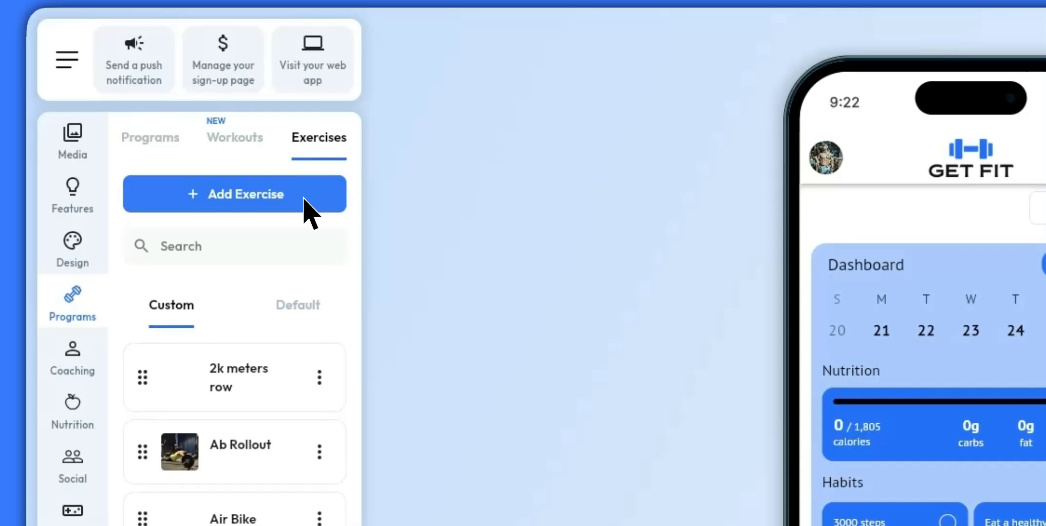 1. Go to Fitness Programs on the App Builder. Click on the Exercises tab, then select Add Exercise.